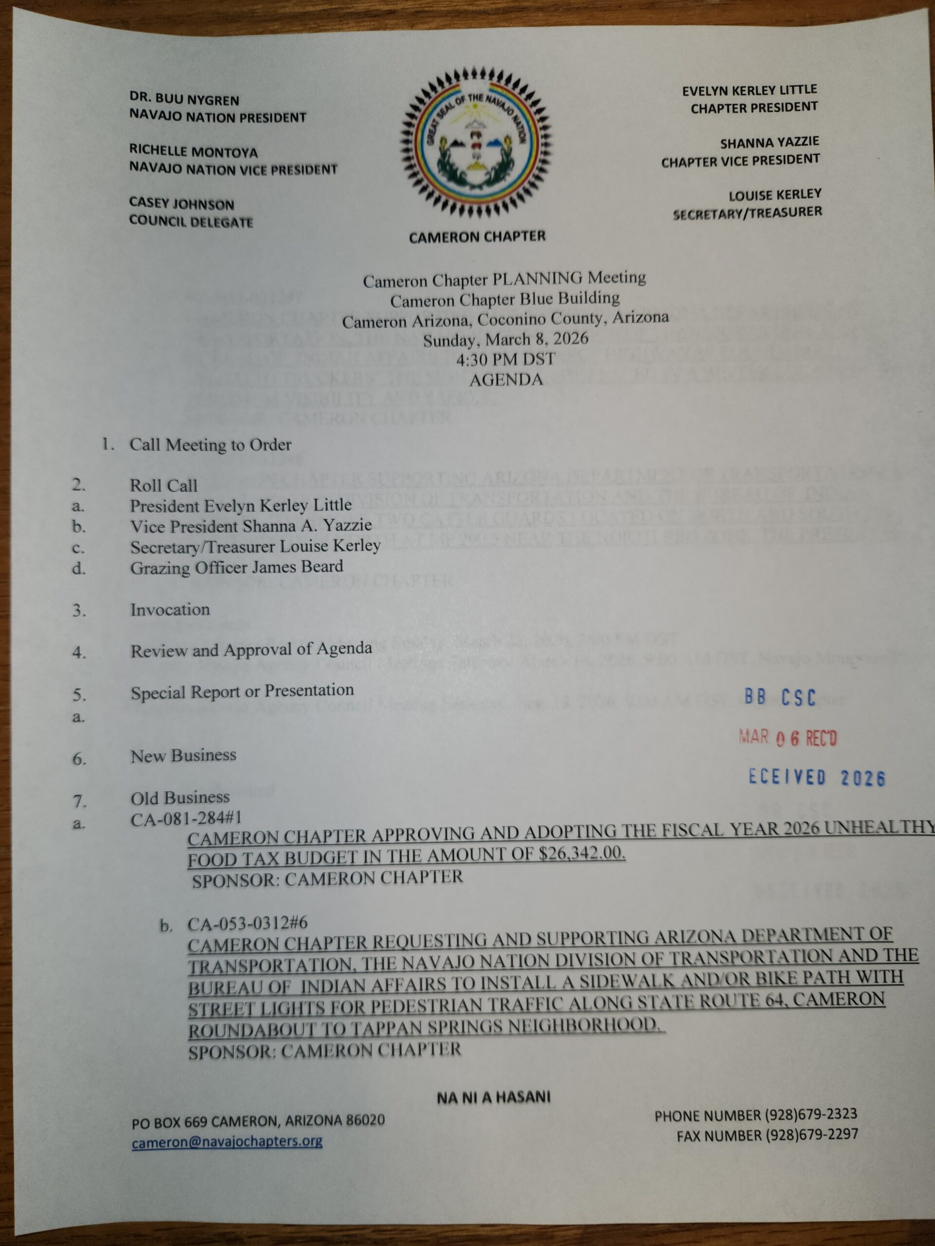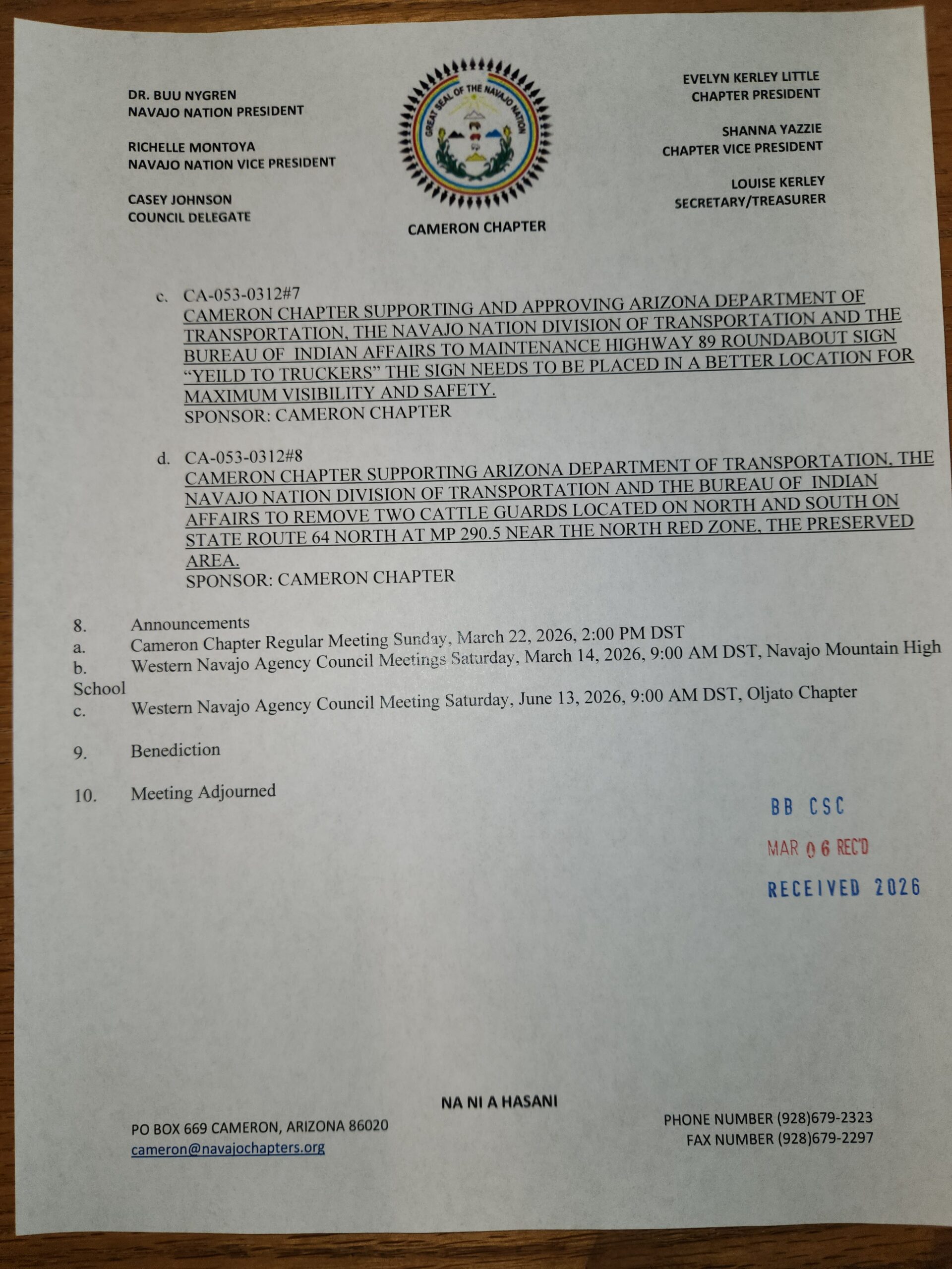 Submit all Letters to the Chapter Office or email Cameron@navajochapters.org